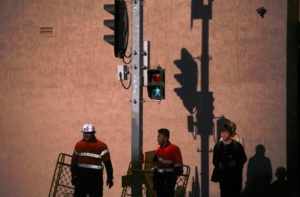 FILE PHOTO: Workers carry barriers as they wait to cross a street at a set of traffic lights with pedestrians at sunset in central Newcastle, located north of Sydney, Australia, August 13, 2018. REUTERS/David Gray/File Photo
