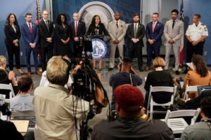 Fulton County District Attorney Fani Willis speaks to the media after a Grand Jury brought back indictments against former president Donald Trump and his allies in their attempt to overturn the state’s 2020 election results, in Atlanta, Georgia, U.S. August 14, 2023. REUTERS/Elijah Nouvelage.