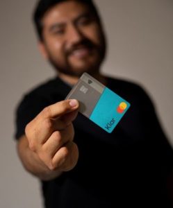 A person poses for a photograph with a credit card from Mexican financial services start-up Klar in Mexico City, Mexico August 4, 2023. Klar/Handout via Reuters