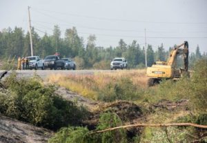 Workers clear trees and create a fire break near Yellowknife after a state of emergency was declared due to the proximity of a wildfire in Yellowknife, Northwest Territories, Canada August 16, 2023. REUTERS/Pat Kane