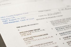 A view of the indictment, after a Georgia grand jury voted to indict former president Donald Trump with several felonies late Monday night in the case investigating attempts to overturn the results of the 2020 presidential election, is pictured at the Reuters Washington office, D.C., U.S. August 14, 2023. REUTERS/Julio-Cesar Chavez