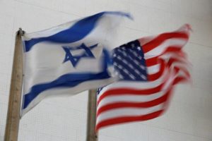 FILE PHOTO: The American and the Israeli national flags can be seen outside the U.S Embassy in Tel Aviv, Israel December 5, 2017. REUTERS/Amir Cohen/File Photo