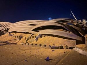Grain warehouses heavily damaged by a Russian drone attack are seen at a compound of a port on the Danube, amid Russia’s attack on Ukraine, in Odesa region, Ukraine August 16, 2023. Press Service of the Operational Command South of the Ukrainian Armed Forces/Handout via REUTERS