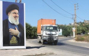 A UN vehicle drives near a picture showing Lebanon’s Hezbollah leader Sayyed Hassan Nasrallah in Adaisseh village, near the Lebanese-Israeli border, southern Lebanon, July 12, 2023. REUTERS/Aziz Taher