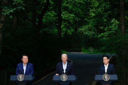 CAMP DAVID, Maryland (Reuters) -U.S. President Joe Biden and the leaders of South Korea and Japan agreed at Camp David on Friday to deepen military and economic cooperation and made their strongest joint condemnation yet of “dangerous and aggressive behavior” by China in the South China Sea.