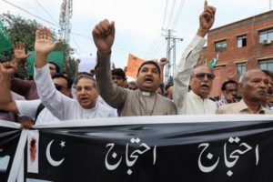Members of the Christian community chant slogans as they hold banner to condemn the attacks on churches and houses in Jaranwala town of Faisalabad, during a protest in Peshawar, Pakistan August 17, 2023. REUTERS/Fayaz Aziz