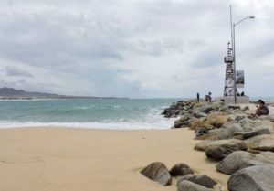 People sit on a breakwater closed as the Category 4 Hurricane Hilary rushes toward Mexico’s Baja California peninsula, in Cabo San Lucas, Mexico August 18, 2023. REUTERS/Monserrat Zavala
