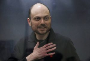 Jailed Russian opposition figure Vladimir Kara-Murza gestures as he stands behind a glass wall of an enclosure for defendants during a court hearing to consider an appeal against his prison sentence, in Moscow, Russia July 31, 2023. REUTERS/Maxim Shemetov