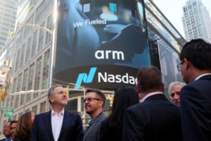 Arm executives and CEO Rene Haas gather outside Nasdaq Market site, as Softbank’s Arm, chip design firm, holds an initial public offering (IPO), in New York, U.S., September 14, 2023. REUTERS/Brendan McDermid