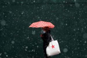 File photo: A woman carrying a Macy’s bag walks in falling snow as a winter storm moves into the northeast of the United States, in Times Square in New York City, New York, U.S., January 26, 2021. REUTERS/Mike Segar/File photo