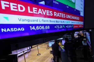 Traders react as a screen displays the Fed rate announcement on the floor of the New York Stock Exchange (NYSE) in New York City, U.S., December 13, 2023. REUTERS/Brendan McDermid
