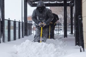 Workers remove snow from the sidewalk after a blizzard left several inches of snow in Ankeny, Iowa, U.S., January 12, 2024. REUTERS/Alyssa Pointer
