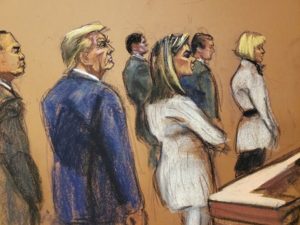 Former U.S. President Donald Trump, E. Jean Carroll and their lawyers stand for the jury as they attend jury selection in the second civil trial after Carroll accused Trump of raping her decades ago, at Manhattan Federal Court in New York City, U.S., January 16, 2024 in this courtroom sketch. REUTERS/Jane Rosenberg