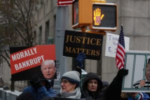 People demonstrate before the arrival of former U.S. President Donald Trump at Manhattan Federal Court for jury selection in the E. Jean Carroll second civil trial after she accused the former president of raping her decades ago, in New York City, U.S., January 16, 2024. REUTERS/Shannon Stapleton