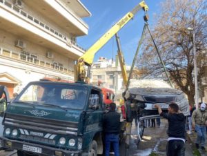 A crane lifts a damaged car near a site that was hit by an Israeli strike according to sources, in the Mazzeh neighborhood of Damascus, Syria January 20, 2024. REUTERS/Firas Makdesi