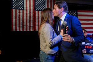 Democratic presidential candidate U.S. Representative Dean Phillips (D-MN) kisses his wife Annalise Glick on stage at a campaign event ahead of the New Hampshire presidential primary election in Rochester, New Hampshire, U.S., January 21, 2024. REUTERS/Faith Ninivaggi