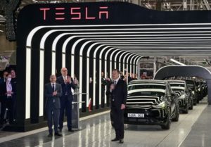 German Chancellor Olaf Scholz, Brandenburg Premier Dietmar Woidke and Elon Musk attend the opening ceremony of the new Tesla Gigafactory for electric cars in Gruenheide, Germany, March 22, 2022. Patrick Pleul/Pool via REUTERS/File Photo