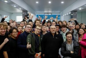 Boris Nadezhdin, an anti-war candidate who was barred from running in the election, meets students after voting on the final day of the presidential election in Dolgoprudny, Moscow region, Russia March 17, 2024. REUTERS/Stringer