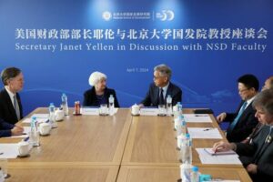 U.S. Treasury Secretary Janet Yellen attends a meeting with Huang Yiping, dean of National School of Development at the Peking University, and other members of the faculty at the Peking University in Beijing, China April 7, 2024. REUTERS/Florence Lo