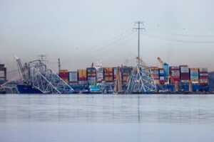 FILE PHOTO: Wreckage of the collapsed Francis Scott Key Bridge lies atop the container ship Dali as salvage work continues in Baltimore, Maryland, U.S., April 8, 2024. REUTERS/Julia Nikhinson/File Photo