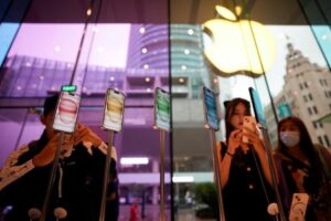 FILE PHOTO: People look at the new iPhone 15 as Apple’s new iPhone 15 officially goes on sale across China, at an Apple store in Shanghai, China September 22, 2023. REUTERS/Aly Song/File Photo