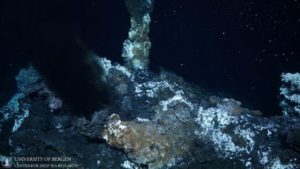 A view shows active chimney venting at the Loki’s Castle Vent Field on the Arctic Mid-Oceanic Ridge, and white microbial mats can be seen on the chimney at a depth of around 2,500m, in this undated handout picture. University of Bergen, Centre for Deep Sea Research/Handout via REUTERS
